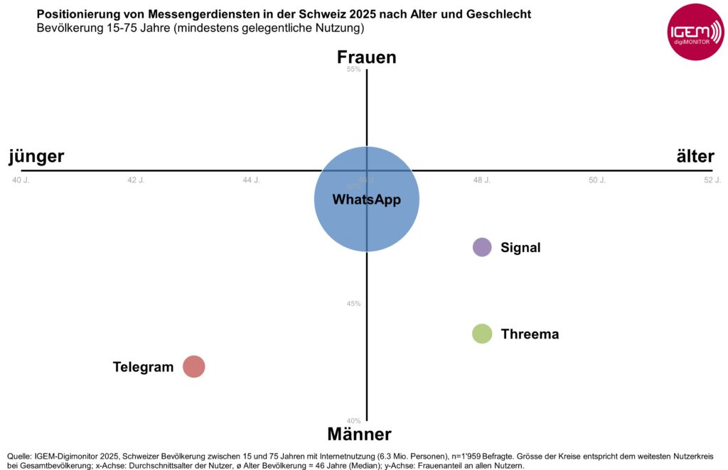 Bei Threema sind 56% der User Männer. WhatsApp hat die ausgeglichenste Verteilung: 49% der User:innen sind weiblich.
