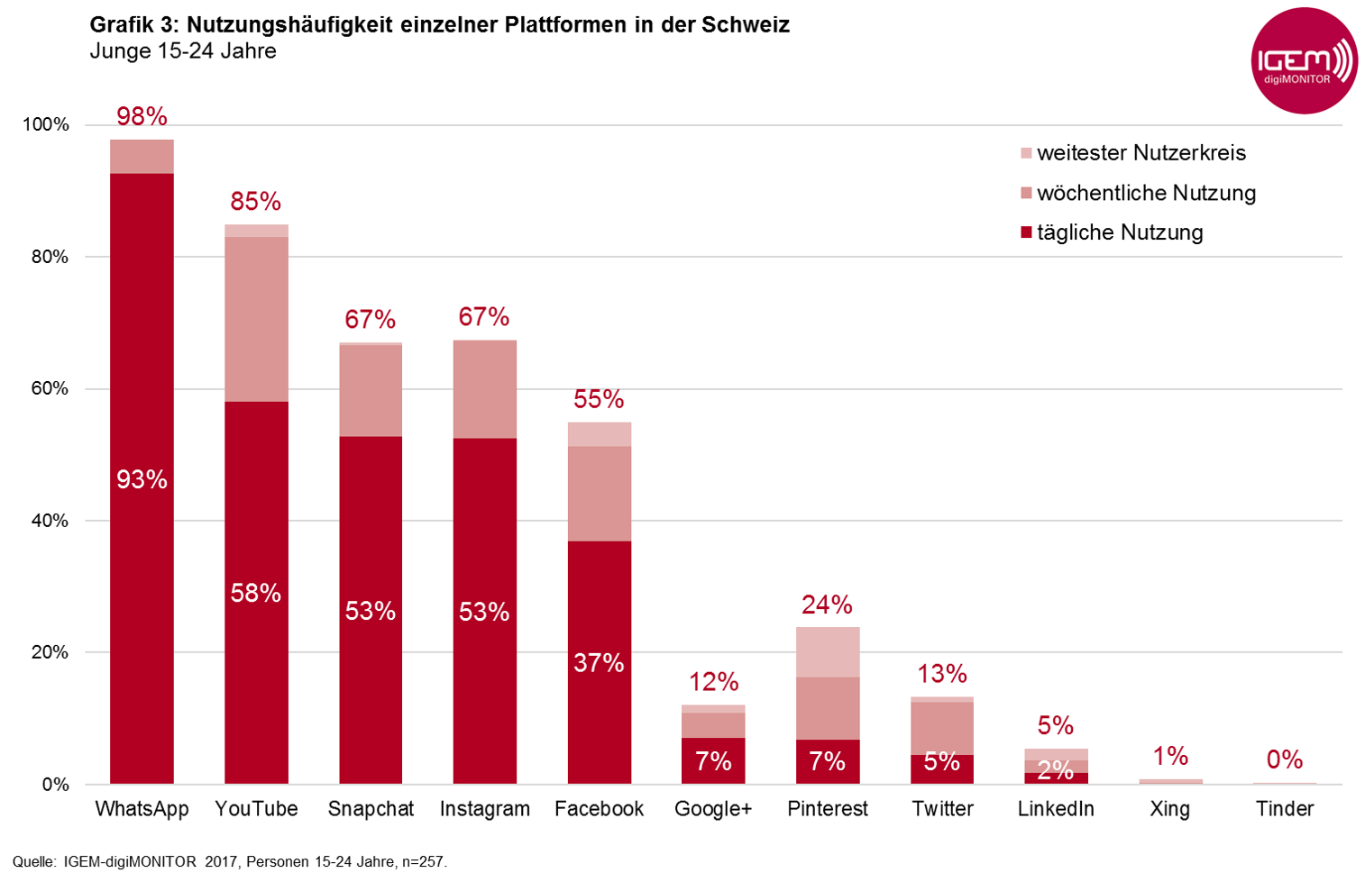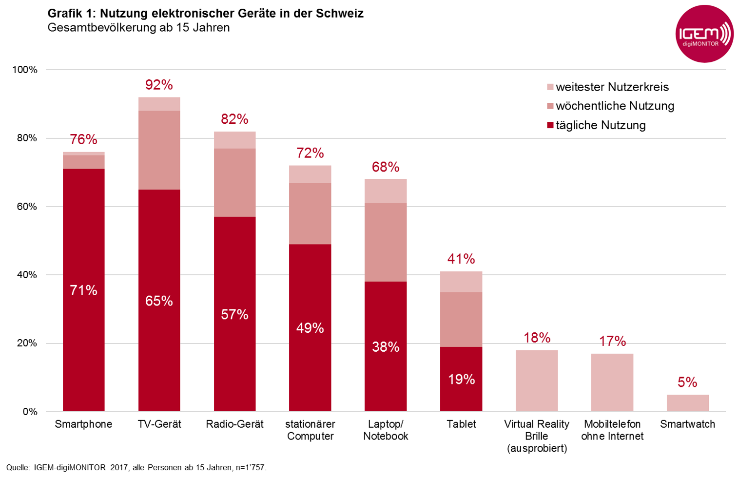 Als einzige Studie mit diesen spezifischen Inhalten ist der IGEM-digiMONITOR repräsentativ für die gesamte Bevölkerung in der Deutsch- und Westschweiz ab 15 Jahren, indem auch die Offliner und Personen ohne (eingetragenen) Festnetzanschluss befragt werden. Der IGEM-digiMONITOR wurde von der Interessengemeinschaft elektronische Medien IGEM zusammen mit der AG für Werbemedienforschung WEMF entwickelt und wird seit 2014 jährlich vom Link Institut in Luzern erhoben. 1’757 Personen ab 15 Jahren haben 2017 an der Telefon-Befragung teilgenommen, davon 1’015 in der Deutschschweiz und 742 in der Romandie.