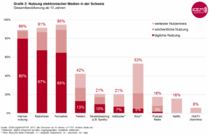 Das Smartphone ist das am intensivsten genutzte elektronische Gerät der Schweiz. Knapp Dreiviertel der Gesamtbevölkerung ab 15 Jahren nutzen täglich ein internetfähiges Handy. Für die Jungen ist das Smartphone das Informations- und Kommunikationsgerät Nummer 1. Mit 98 Prozent sind praktisch alle Jungen im Alter von 15-24 Jahren täglich am Smartphone. Parallel zur steigenden Nutzung des Smartphones verlieren stationäre Computer und Tablets langsam an Bedeutung. Nur das TV-Gerät und das Radio-Gerät erreichen insgesamt noch mehr Personen als das Smartphone. (Grafik 1) Diese Entwicklung zeigt der in Zusammenarbeit mit der WEMF erhobene IGEM-digiMONITOR 2017.