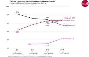 - Snapchat und Instagram überholen Facebook bei den Jungen deutlich. Pinterest wächst am stärksten und ist bei Frauen und in der Romandie besonders beliebt.