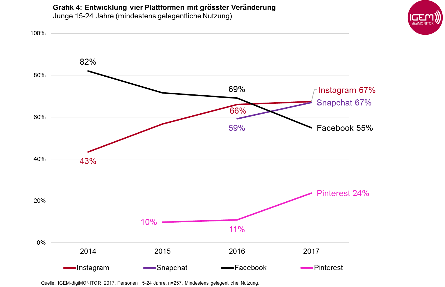 Digimonitor 2017: Snapchat und Instagram überholen Facebook bei den 15- bis 24-Jährigen